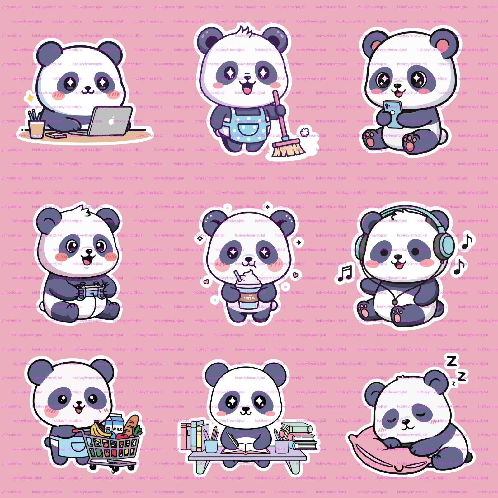 Bu sevimli Kawaii Panda Aktivite Vektör Seti ile projelerinize "pozitif" bir hava katın! Bu pakette, çalışmak, müzik dinlemek, uyumak ve market alışverişi yapmak gibi çeşitli günlük aktivitelerde bulunan 9 benzersiz panda illüstrasyonu bulunmaktadır.