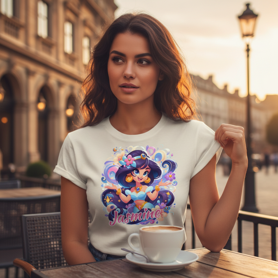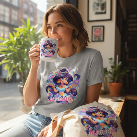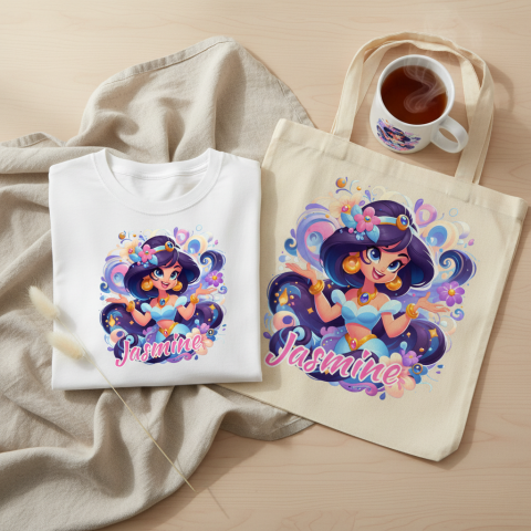 Prenses Jasmine temalı, yüksek çözünürlüklü (300 DPI) şeffaf PNG dosyası! Sublimasyon, DTF ve her türlü dijital baskı projesi için idealdir. Arka planı transparan olan bu tasarım ile kupa, tişört ve kişiye özel hediyeliklerde profesyonel sonuçlar alın."